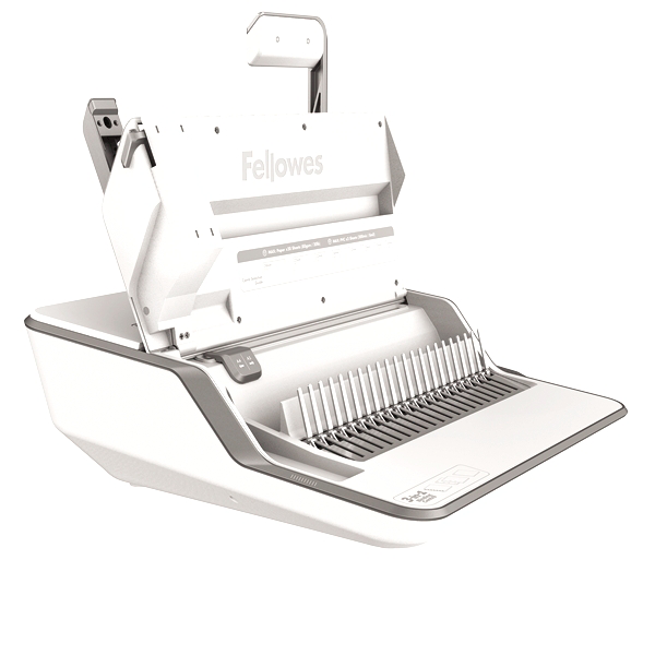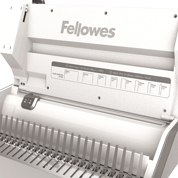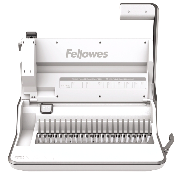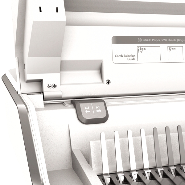 Comb binds documents of up to 300 pages with a 20‐sheet manual punch capacity and 38mm max comb size.