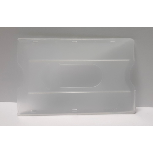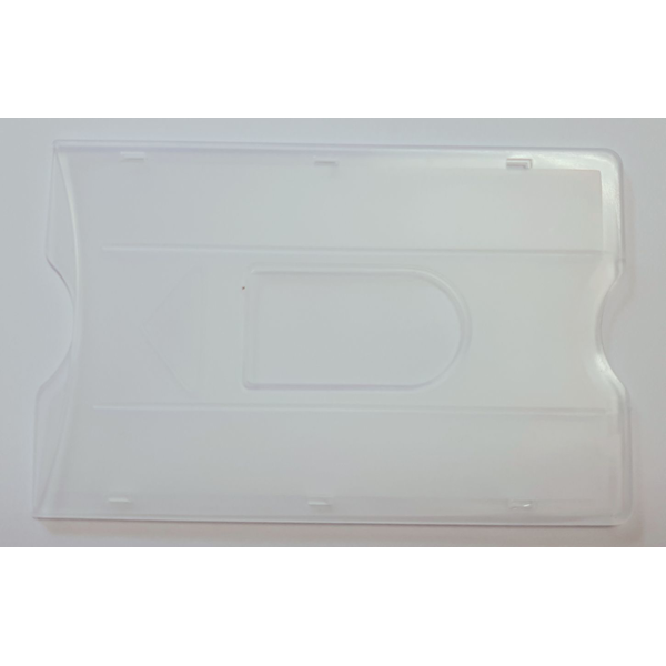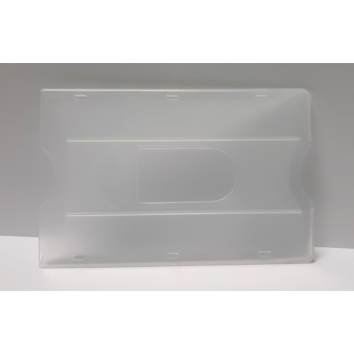 Rigid polyprophylen Name badge for size 54 x 86 mm - landscape with side cutout for easy use. Protect plastic cards against mechanical demadge, UV radiation, antistatic electric charge..