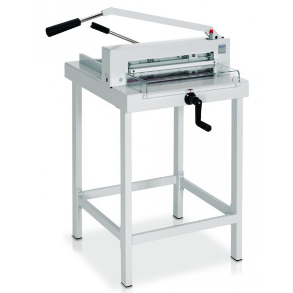 Manual office-guillotine. SCS - the Safety Cutting System made by EBA provides numerous safety features: hinged, transparent safety guard on the front table (locks automatically while cutting); transparent safety cover on the rear table; safety catch (locks blade lever in upper position); safe and convenient blade change from the front without removing machine covers; blade changing device with covered cutting edge; blade depth adjustment from the outside of the machine; cutting stick can be turned or replaced easily from the outside of the machine. Cuts up to 500 sheets of paper (70 g/m2) or bound brochures up to 40 mm. Blade made of German high quality steel. Solid steel blade carrier. Adjustable blade guides made of hardened steel. Patented fast flick action clamp. Side lay with measuring scale (mm / inches). Spindle guided backgauge with hand crank. Fine adjustment of measurement with calibrated scale on the backgauge hand crank. Solid allmetal construction. Designed as table top machine, a stand is available as an option (at an extra cost).
