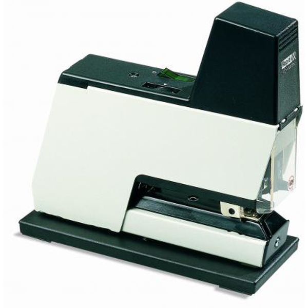 A thin electric stapler for office and packaging stapling. Two or more staplers can be connected in series with fibre optic cable for stapling simultaneously. Pneumatic damping gives agreeable and quiet sequence of operation. Rapid 105 has a steplessy adjustable force and the stapling depth is also adjustable. The stapling is automatic or with a pedal. Udes with 66/6-8.